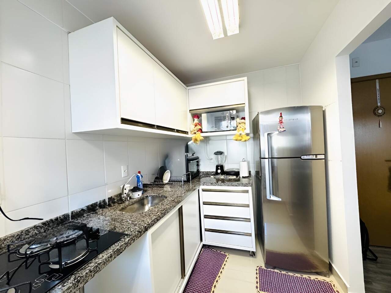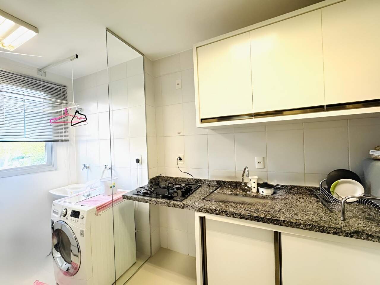 A cozinha estilo americana já está equipada com armários planejados, trazendo mais funcionalidade ao espaço.